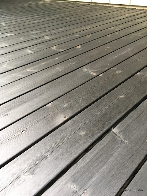 Maalasimme terassin kahteen kertaan. Pinnasta tuli tasaisempi, syvän musta jossa näkyy puun syyt ja oksat silti läpi. Terassimme sai elinvuosia lisää ja tykkään todella paljon miltä se näyttää. Pinnasta tuli nyt niin vettä hylkivä että pitää saunasta hakee kuminen lattialasta ja sillä pyyhkiä vedet pois!